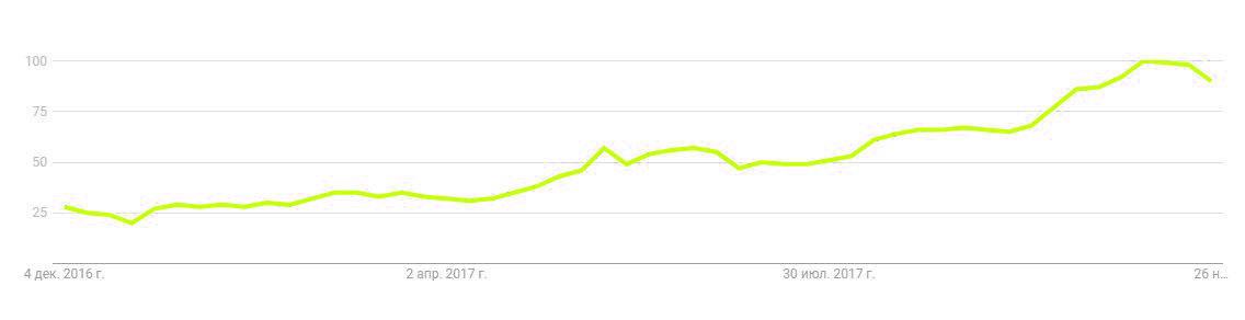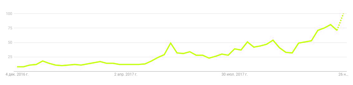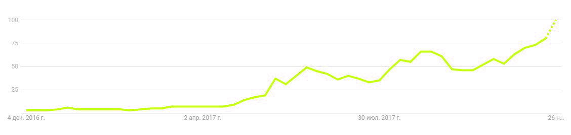 Динамика роста поисковых запросов, связанных с блокчейн,с ноября 2016 по ноябрь 2017 по данным Google Trends