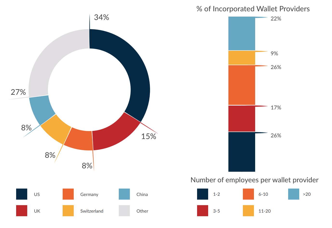 Суммарно 81% провайдеров кошельков базируется в Северной Америке (30%) и Европе (31%). 20% пользователей проживают в Азиатско-тихоокеанском регионе и ещё 13% — в странах Латинской Америки.